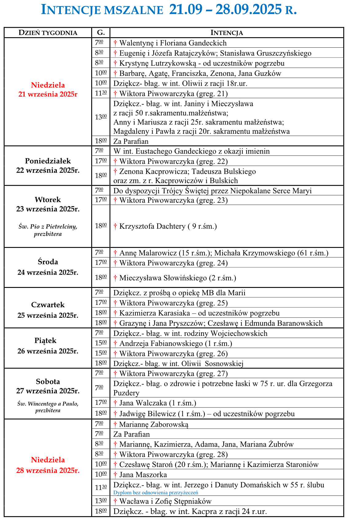 Intencje mszalne 21.09.2025 – 28.09.2025 r.