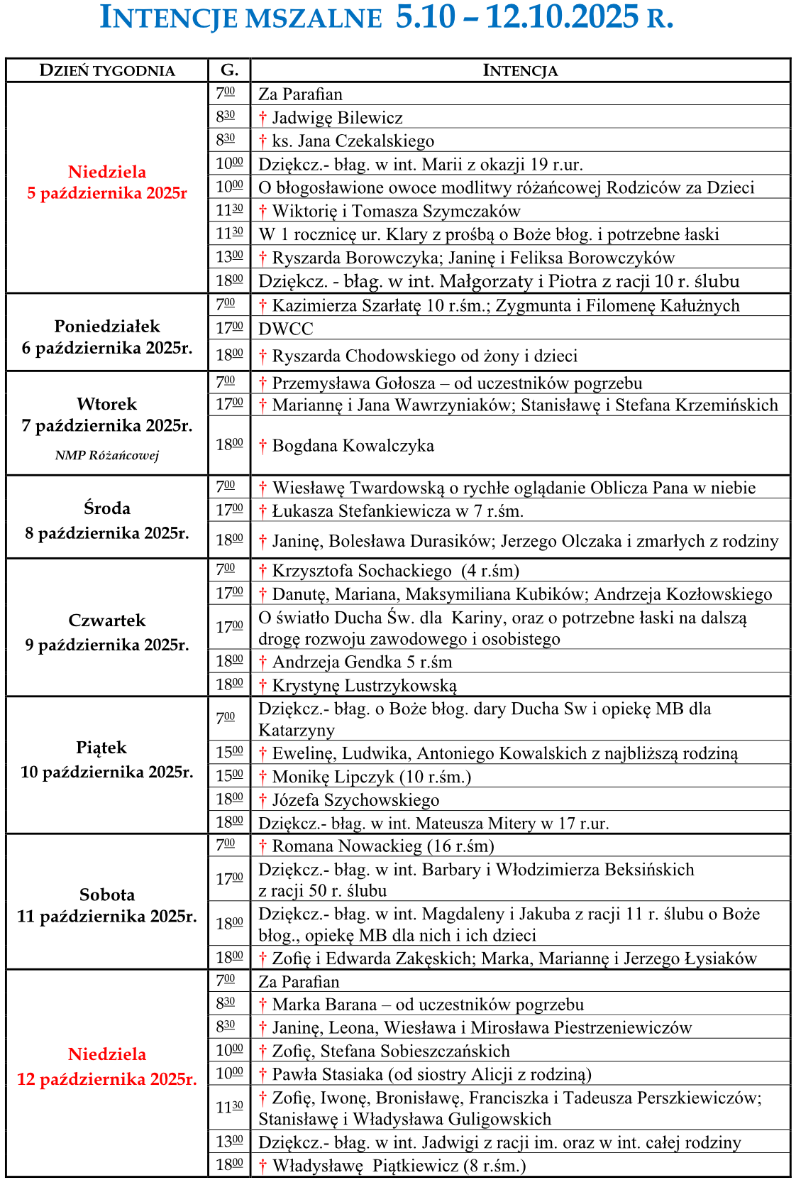 Intencje mszalne 05.10.2025 – 12.10.2025 r.