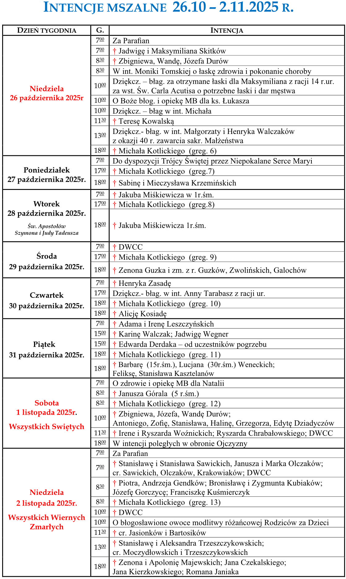 Intencje mszalne 26.10.2025 – 2.11.2025 r.