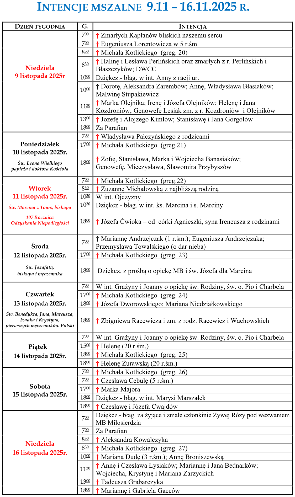 Intencje mszalne 9.11.2025 – 16.11.2025 r.