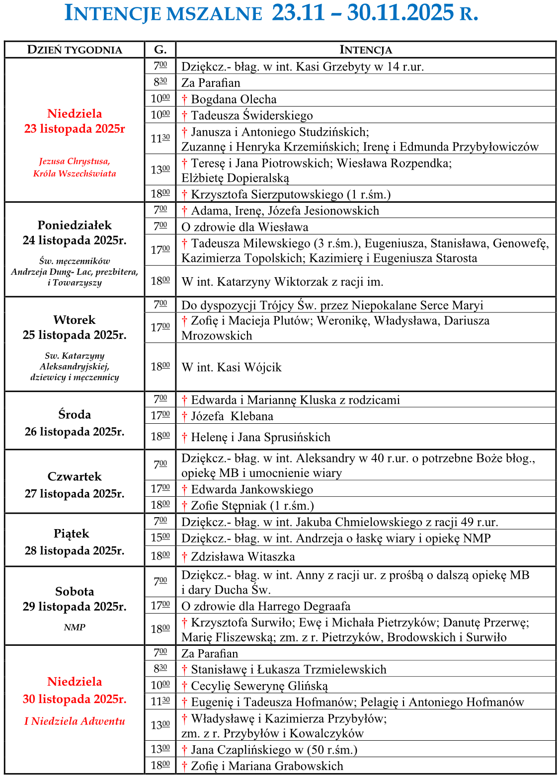 Intencje mszalne 23.11.2025 – 30.11.2025 r.