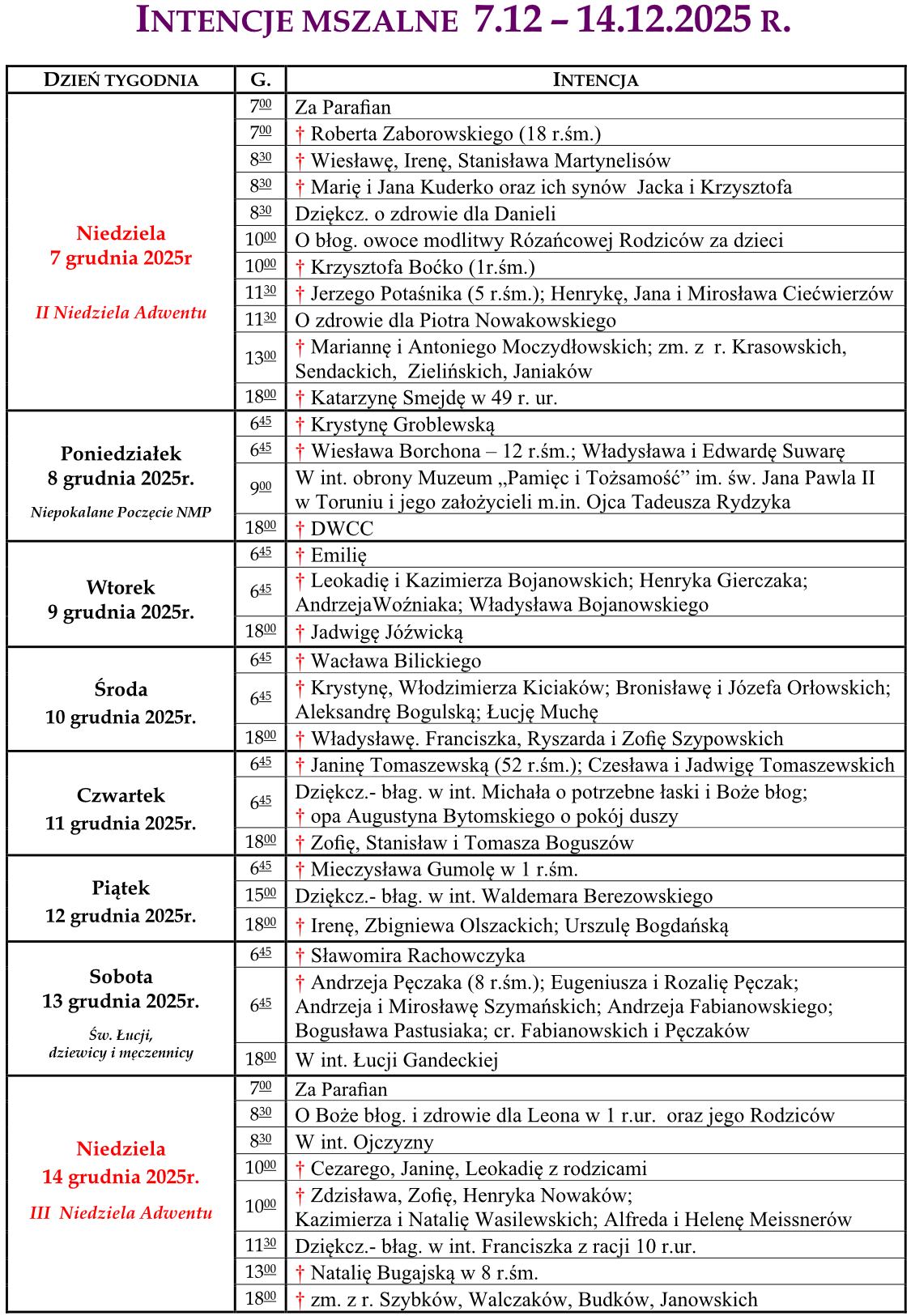 Intencje mszalne 7.12.2025 – 14.12.2025 r.