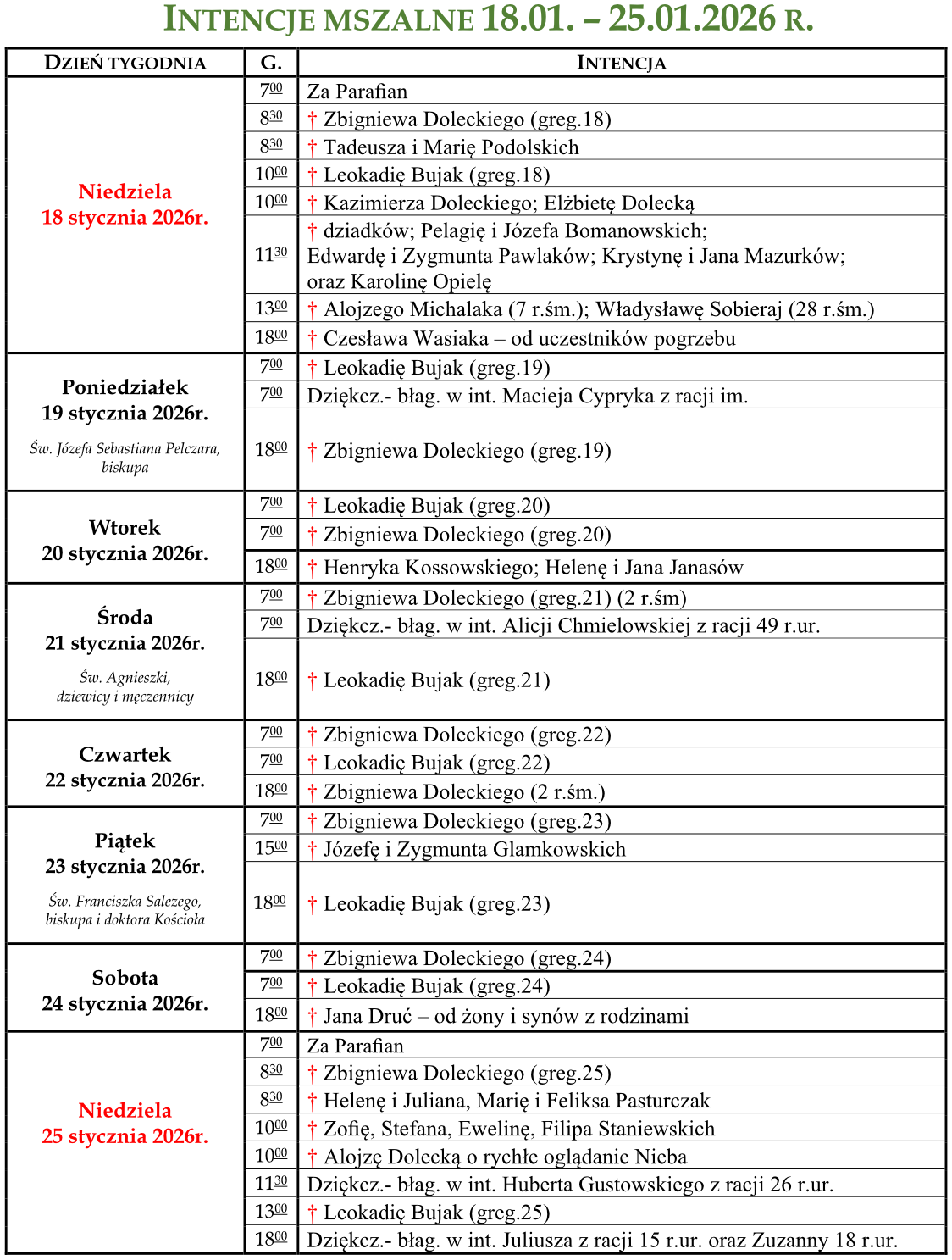 Intencje mszalne 18.01.2026 – 25.01.2026 r.