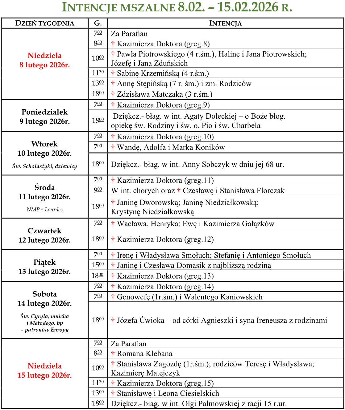 Intencje mszalne 8.02.2026 – 15.02.2026 r.