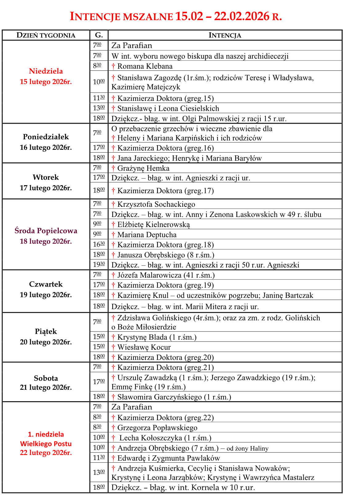 Intencje mszalne 8.02.2026 – 15.02.2026 r.