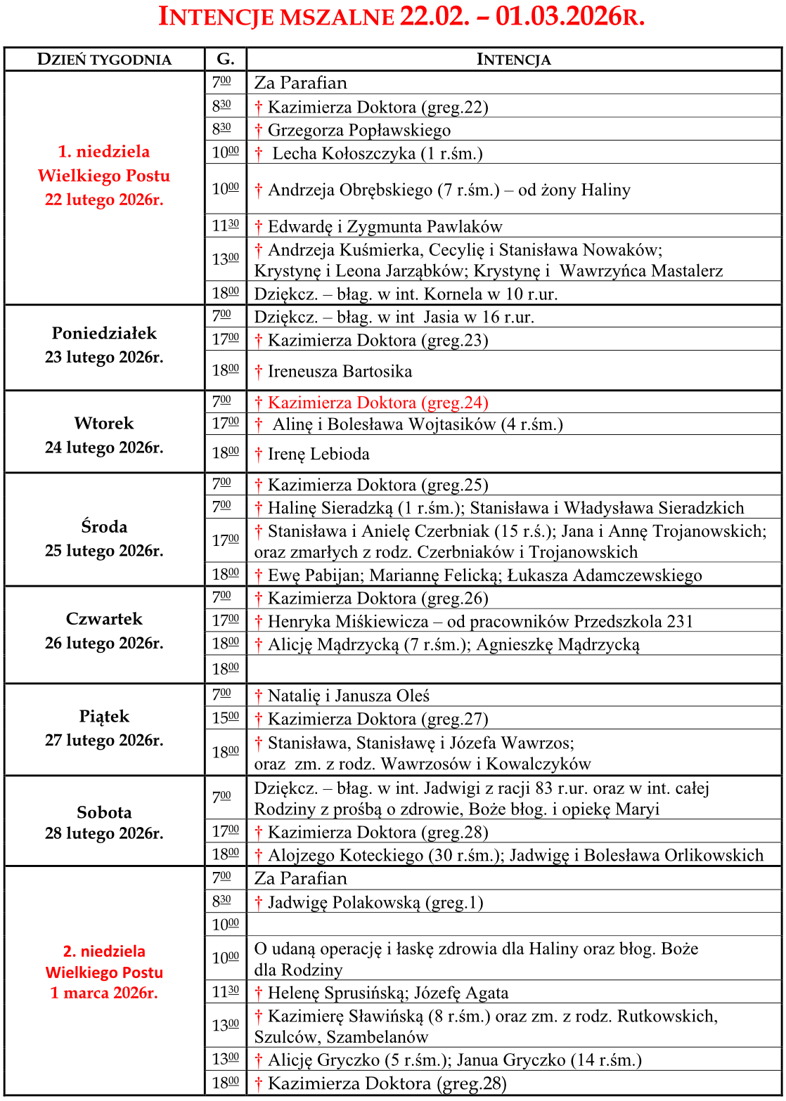 Intencje mszalne 22.02.2026 – 1.03.2026 r.
